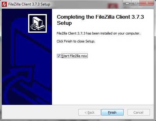 Al final la instalacion, deje marcada la opción "Start FileZilla now". Y luego haga click en "Finish".