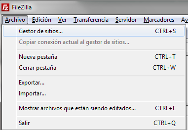 Para empezar a transferir archivos a tu hosting con FileZilla, debemos hacer click en el menu "Archivo" y elegir la opción "Gestor de sitios".