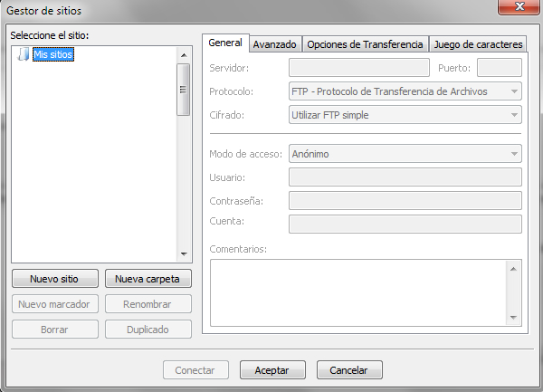 Se abrirá la siguiente ventana. Para crear una cuenta para transferir archivos haga click en "Nuevo Sitio"