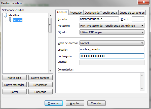 Se creara una nueva entrada y escribe el nombre que quiera, en este caso "Mi sitio" y luego le das a la tecla Enter para guardar el nombre. Luego en el lado derecho de la pantalla configuraremos los datos de la cuenta de FTP de tu hosting: En Servidor esctribe el nombre de tu sitio sin el "www.". Por ejemplo si tu sitio se llama www.nombredetusitio.cl en el nombre de servidor debes escribir nombredetusitio.cl En Protocolo: dejar la opcion "FTP - Protocolo de Transferencia de Archivos" En cifrado debes dejar elegido : "Utilizar FTP Simple" En el modo de Acceso debes elegir "Normal" Escribe despues tu usuario y contraseña que tu proveedor de hosting te ha proporcionado al contratar el servicio. Finalmente. Haga click en conectar.