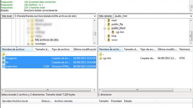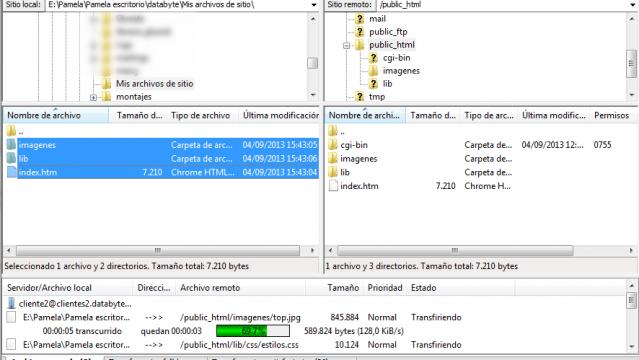 En el arbol de archivos del lado derecho de la pantalla se encuentran sus archivos locales, en el lado izquierdo los del servidor. Usualmente los archivos de su sitio web se encuentran en la carpeta "/public_html". Para enviar los archivos locales al remoto, solo basta con seleccionar en el lado local y arrastrar y soltar en los remotos.