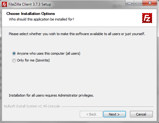 Luego comenzaremos la configuración de la instalacion de FileZilla. Primero elegiremos si el programa lo puede usar cualquier usuario del equipo, o solo el usuario que esta instalando el programa. Elija la opción segun sus necesidades.