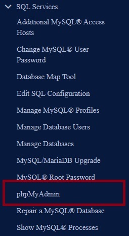 Paso 3: En el menú lateral izquierdo del WHM ubica la sección de "SQL Services", expándelo y selecciona la opción de phpMyAdmin.